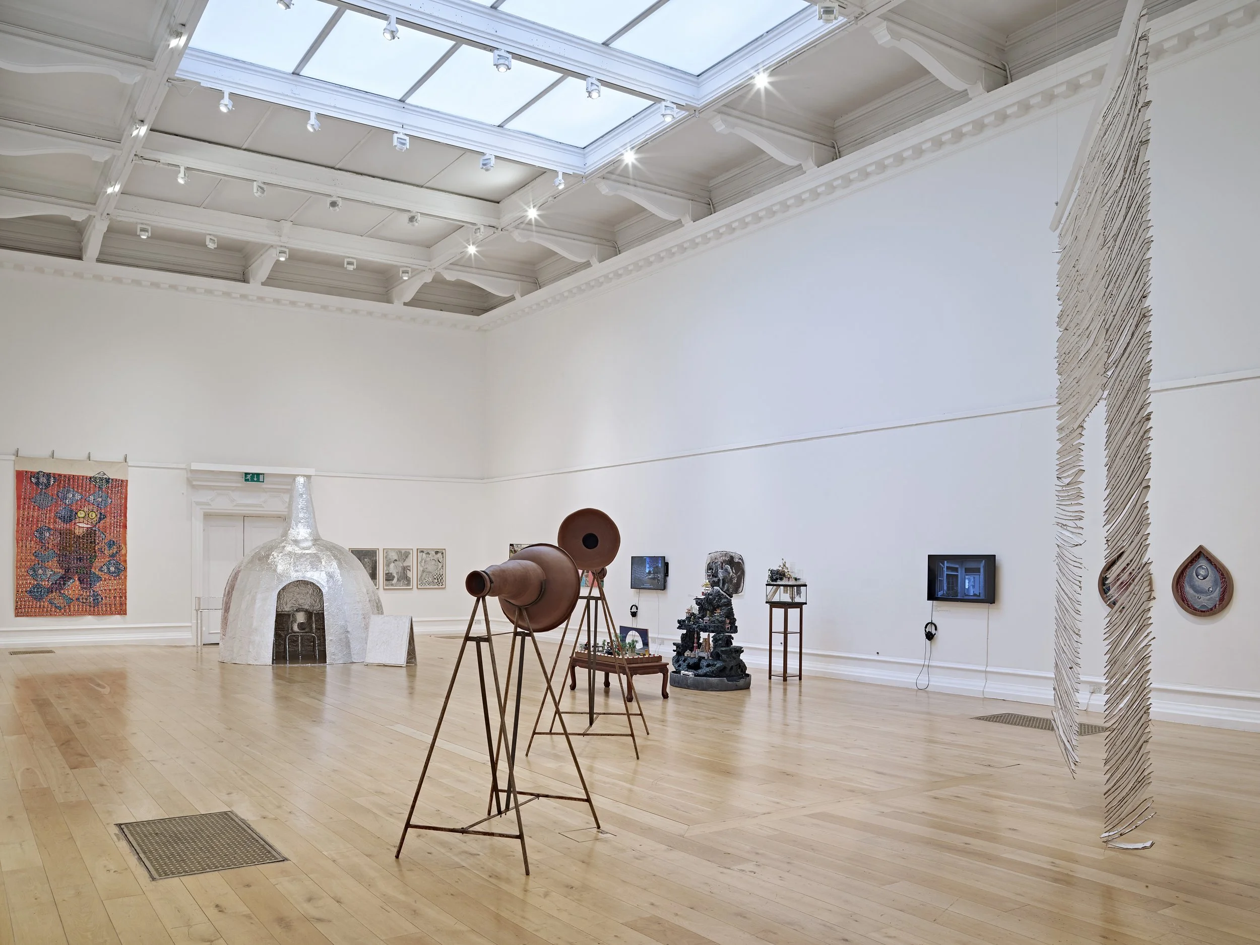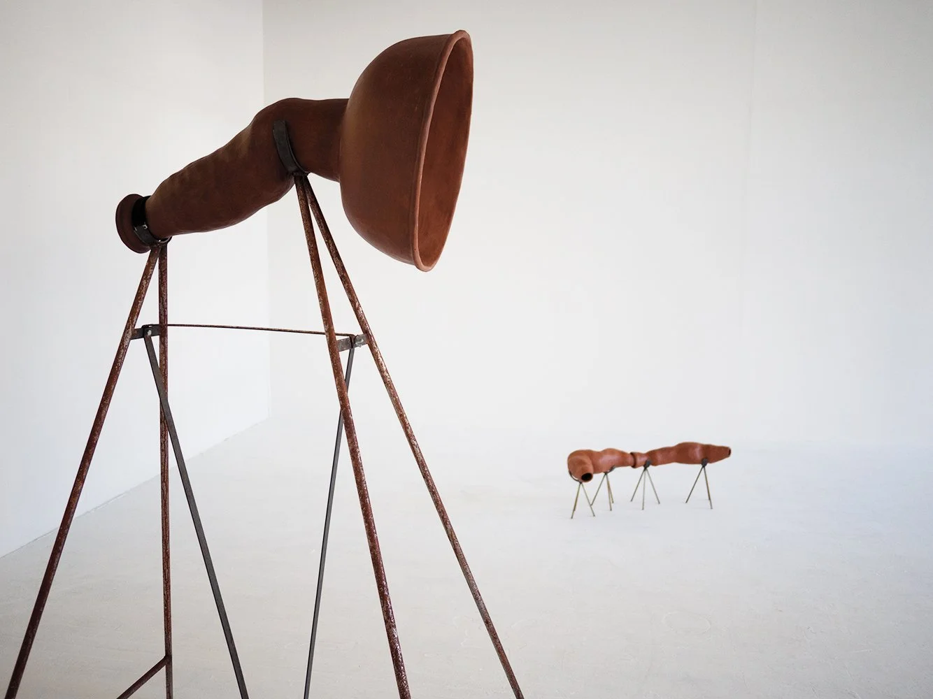 For the installation I’ve decomposed certain elements from these memories and created a sculptural installation, in which the space is transformed through sound with a recording of handmade ceramic flutes played through several large burnished ceramic megaphones.